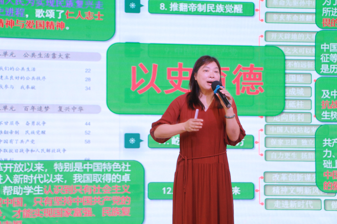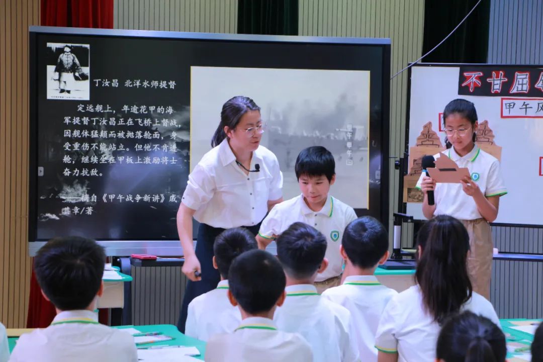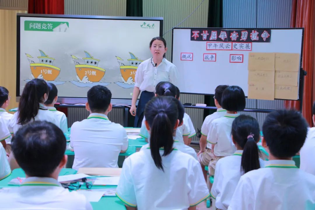 义乌市江东第一小学钱璐莹老师执教《甲午风云》,创设“甲午风云史实展”,学生演战斗情形、描画战舰、制作人物名片体悟黄海海战中的抗争,将《南京条约》《马关条约》《辛丑条约》等多个不平等条约内容进行对比,学生思考从鸦片战争开始的百年屈辱,懂得“落后就要挨打,自强不息才能立于不败之地”的道理。