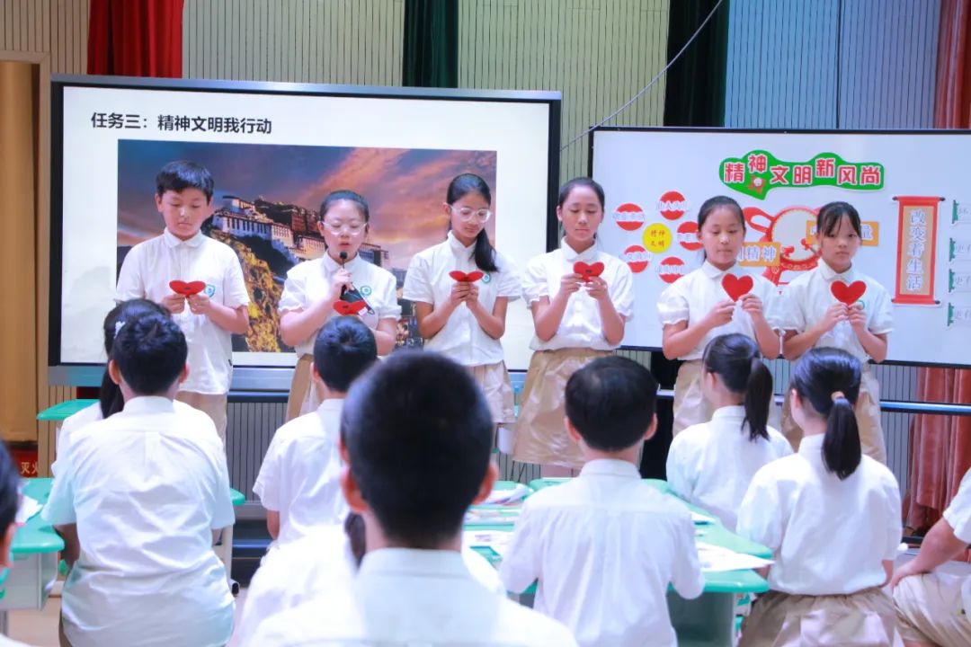 义乌外国语学校黄莉老师带领学生“走近精神文明新风尚”,通过生活事例理解精神文明内涵,学生合作学习了解国家政府社会大力推动精神文明建设举措,领悟中国精神,感受中国力量。
