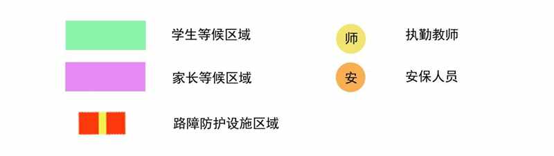主校门接送区设有学生等待区和家长等待区,放学时,各班学生排着整齐的队伍到相应的学生等候区等待家长们的到来。两个区域之间安装防冲撞柱,设置老师护学岗和家长护学岗,并安排相应的安保人员维持秩序。为解决家长接送学生不及时和阴雨天接送不便的问题,学校还将接送区分为阳光明媚露天接送和阴雨天气室内接送两种模式。