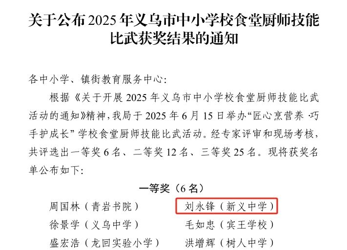 ÔÚ½üÈÕ¾ÙÐеÄÒåÎÚÊÐÖÐСѧУ¡°½³ÐÄÅëÓªÑø¡¤ÇÉÊÖ»¤³É³¤¡±Ê³ÌóøÊ¦¼¼ÄܱÈÎä»î¶¯ÖУ¬ÎÒУ³øÊ¦ÁõÓÀ·æÔÚÖÚ¶à²ÎÈüÑ¡ÊÖÖÐÍÑÓ±¶ø³ö£¬ÈÙ»ñÒ»µÈ½±¡£